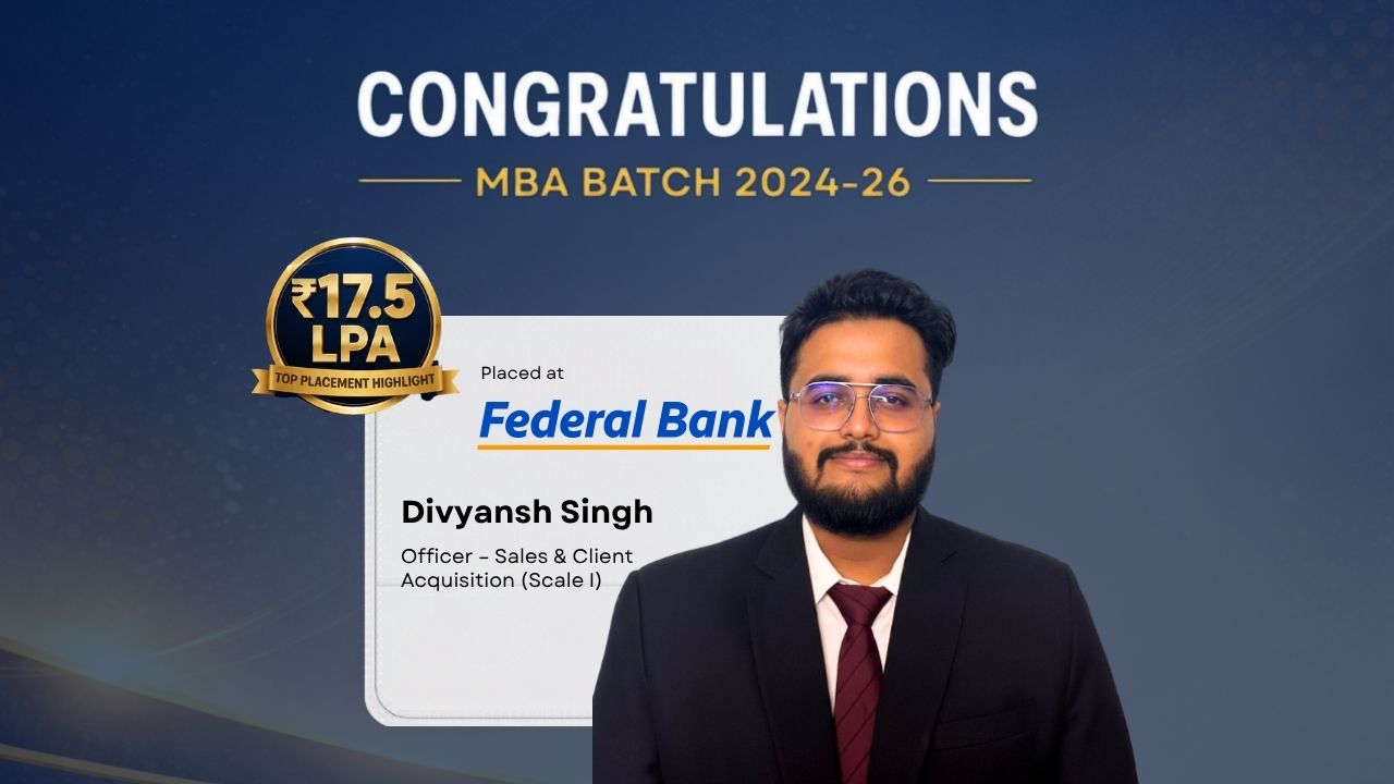 A student from the MBA Batch 2024–26 has secured a position with Federal Bank at an impressive package of ₹17.5 LPA. The role offered is Officer – Sales & Client Acquisition (Scale I), reflecting the increasing demand for skilled professionals in the banking and financial services sector.
