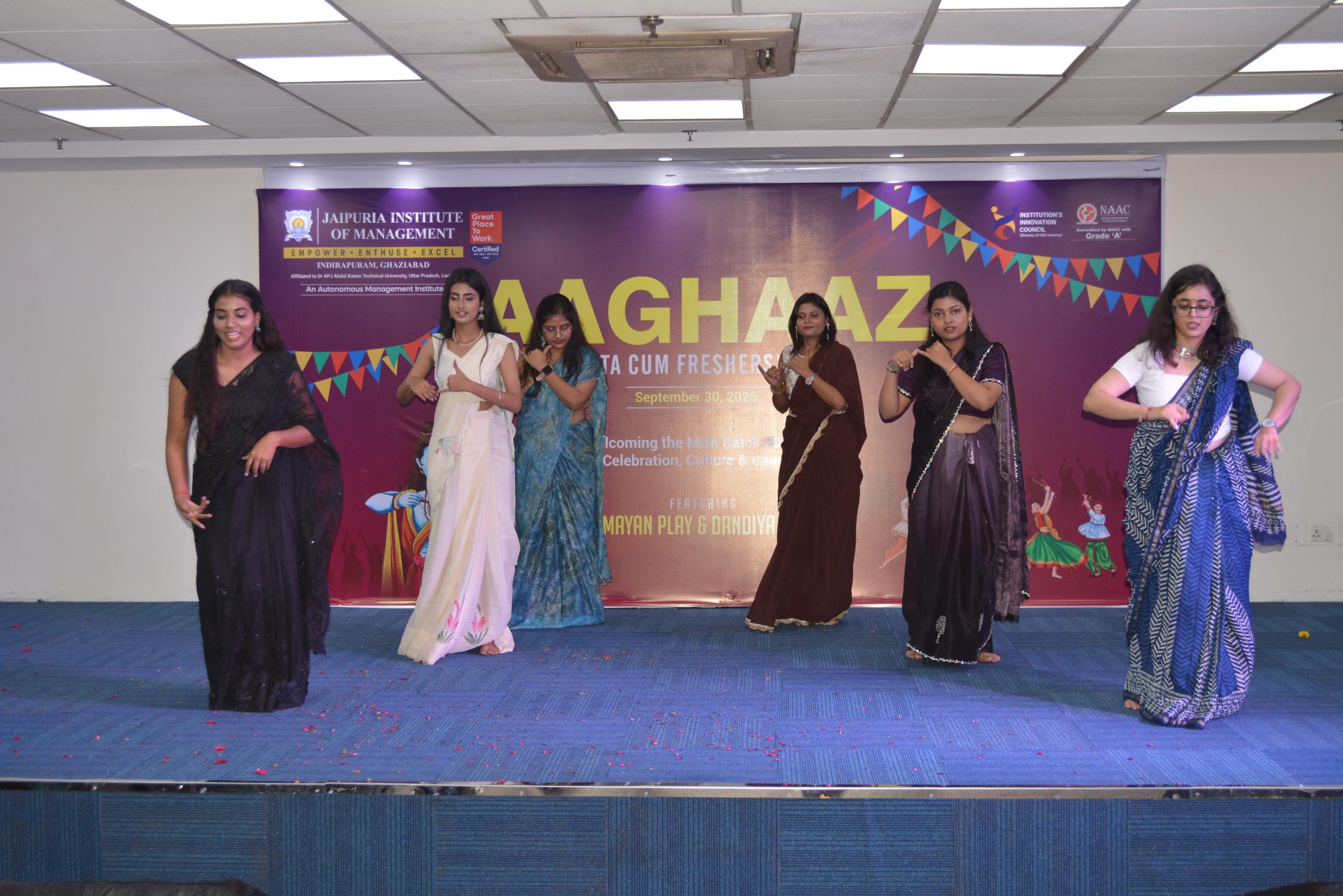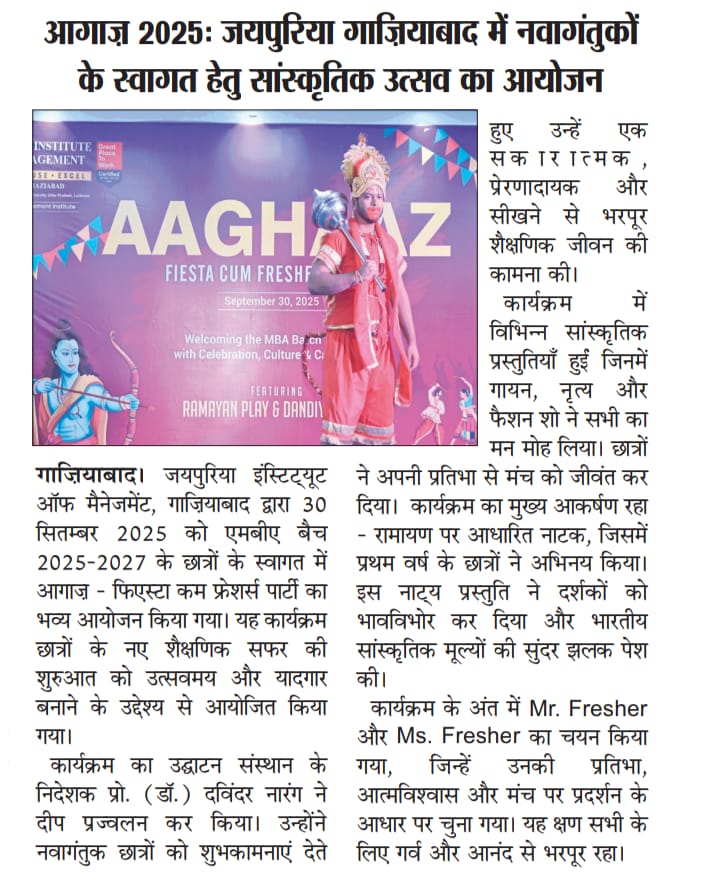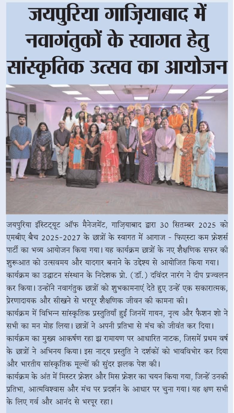 Jaipuria Institute of Management, Ghaziabad celebrated AAGHAAZ 2025, the annual Fiesta cum Freshers’ Party, with grandeur and infectious enthusiasm on 30th September 2025 at the JIM Ground. The event marked the vibrant beginning of the academic journey for the MBA Batch 2025–27, bringing together tradition, creativity, and celebration in one unforgettable evening.