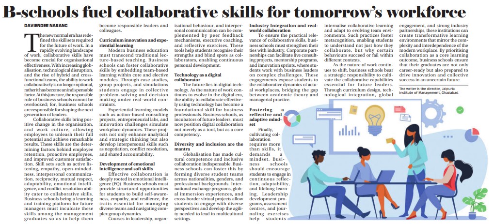 The new normal era has redefined the skill sets required for the future of work. In a rapidly evolving landscape of work, collaborative skills have become crucial for organisational effectiveness. With increasing globalisation, technological disruption and the rise of hybrid and cross- cross-functional teams, the ability to work collaboratively is no longer optional, rather it has become an indispensable factor. At this juncture, the responsible role of business schools cannot be overlooked, for, business schools are responsible for shaping the next generation of leaders.