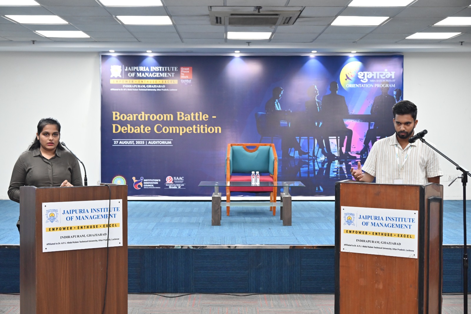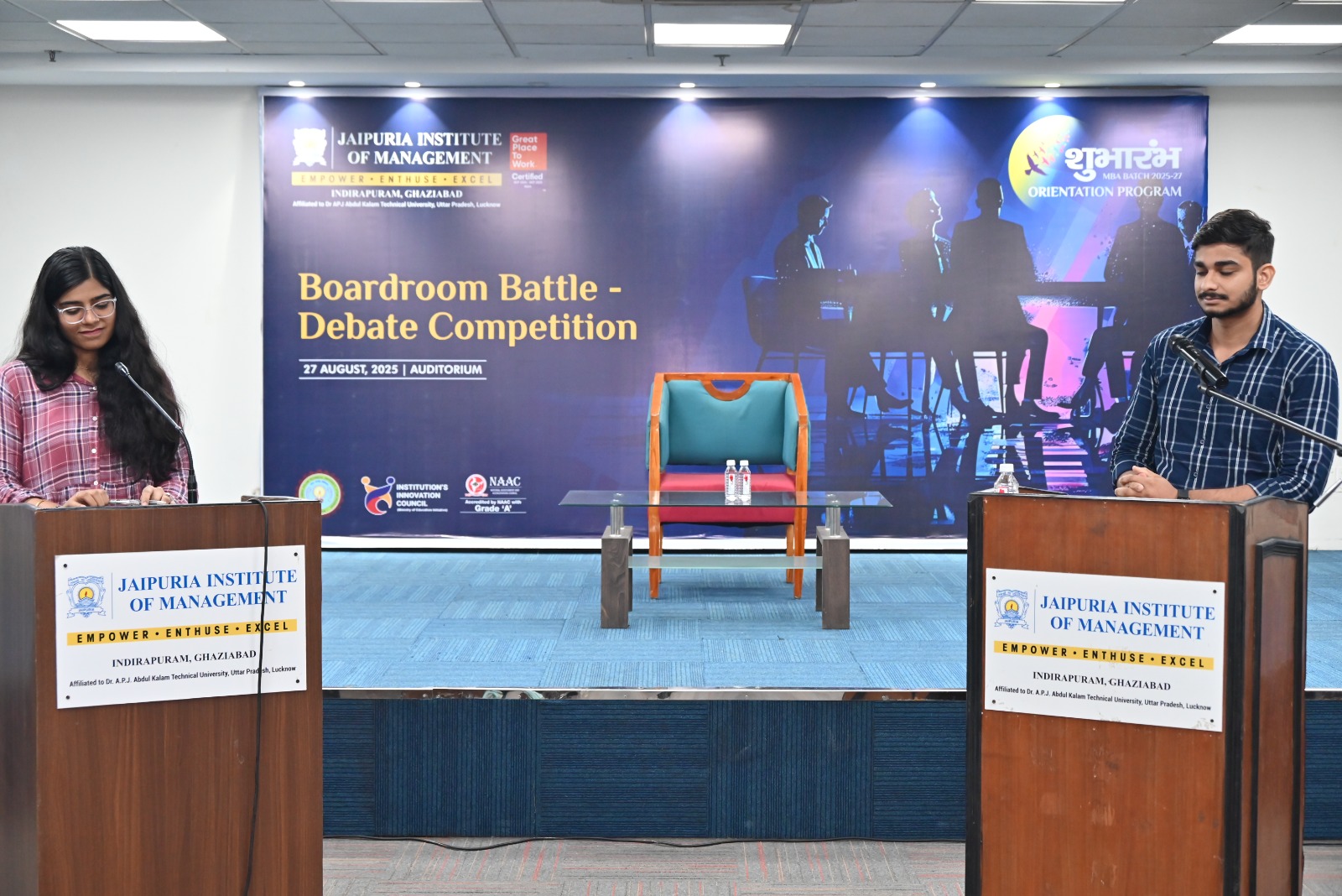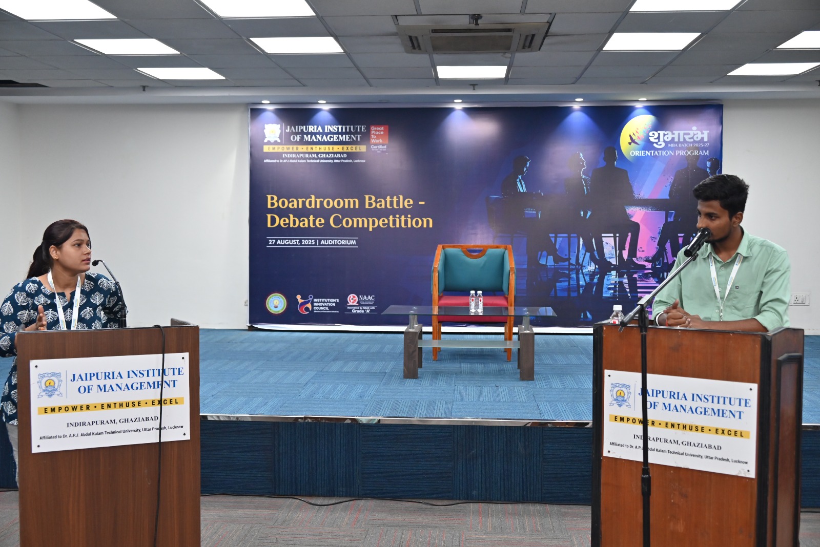 On 27th August 2025, the Jaipuria Institute of Management, Ghaziabad celebrated National Entrepreneurship Day with a thought-provoking Debate Competition that brought together budding entrepreneurs and critical thinkers from across programs. The event aimed to spark engaging discussions on the evolving entrepreneurial landscape in India and beyond, while fostering analytical and presentation skills among students.