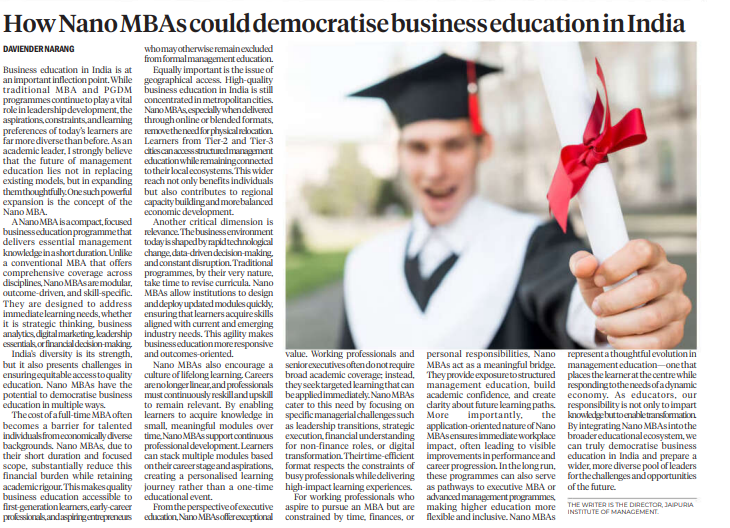 Business education in India has traditionally been associated with full-time MBA and PGDM programs offered by leading institutions. While these programs play a crucial role in leadership development and managerial training, they often remain inaccessible to many aspirants due to financial, geographic, and time constraints. In this evolving context, Nano MBAs are emerging as a powerful alternative that has the potential to democratise business education across the country.