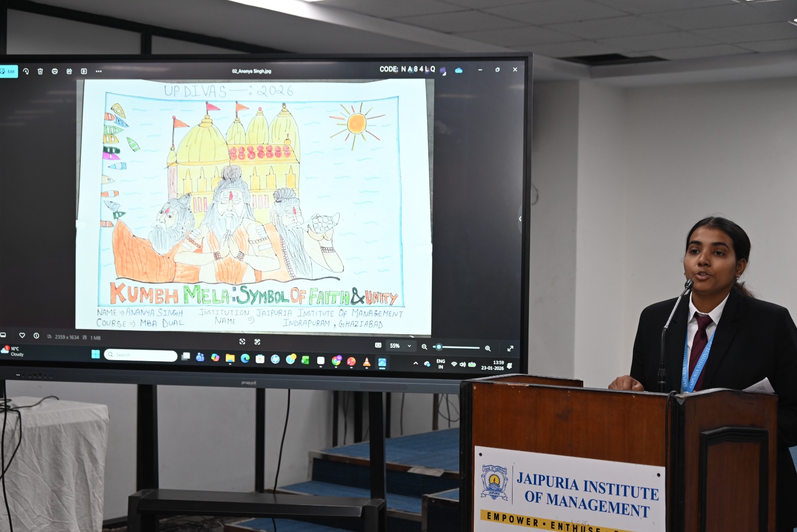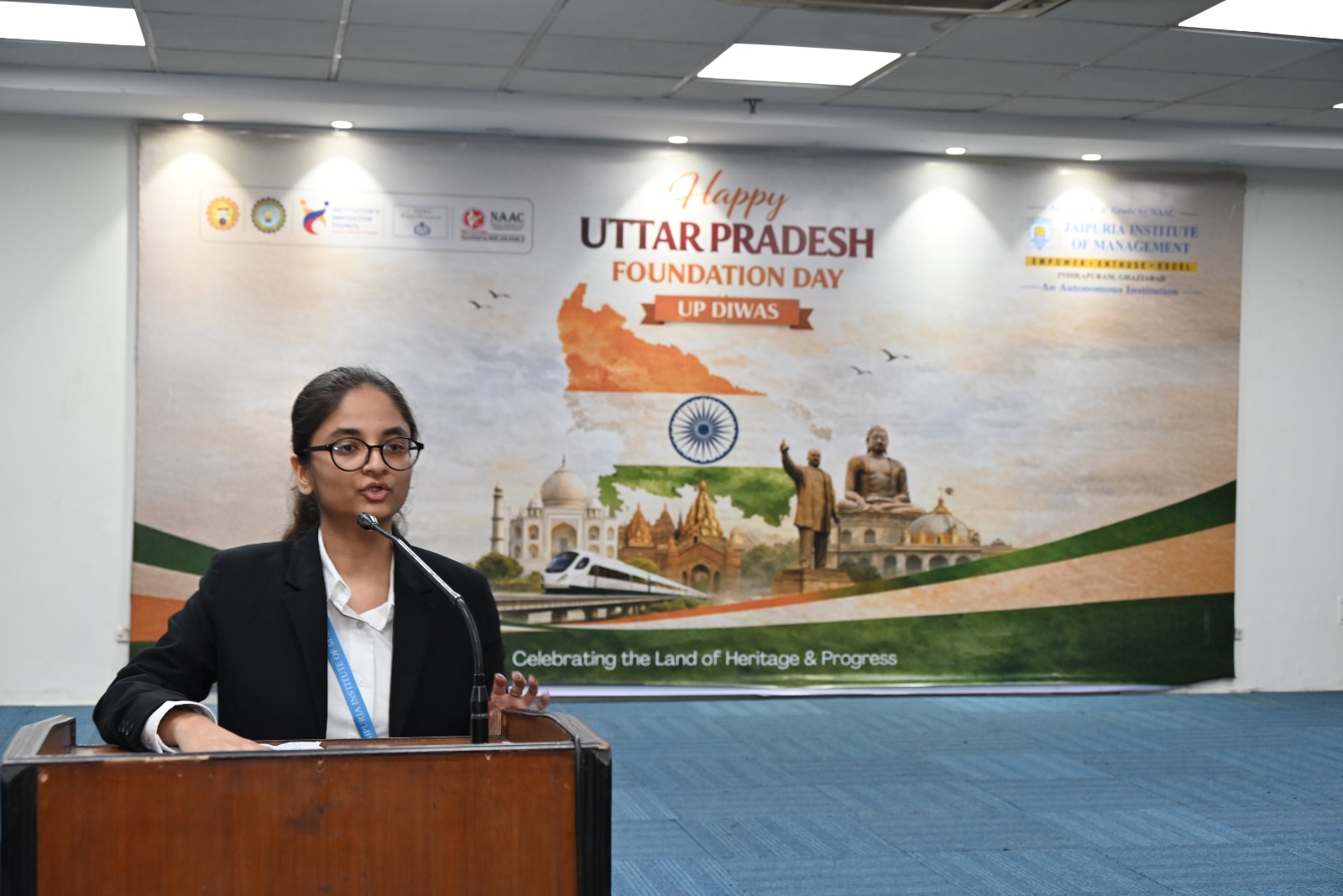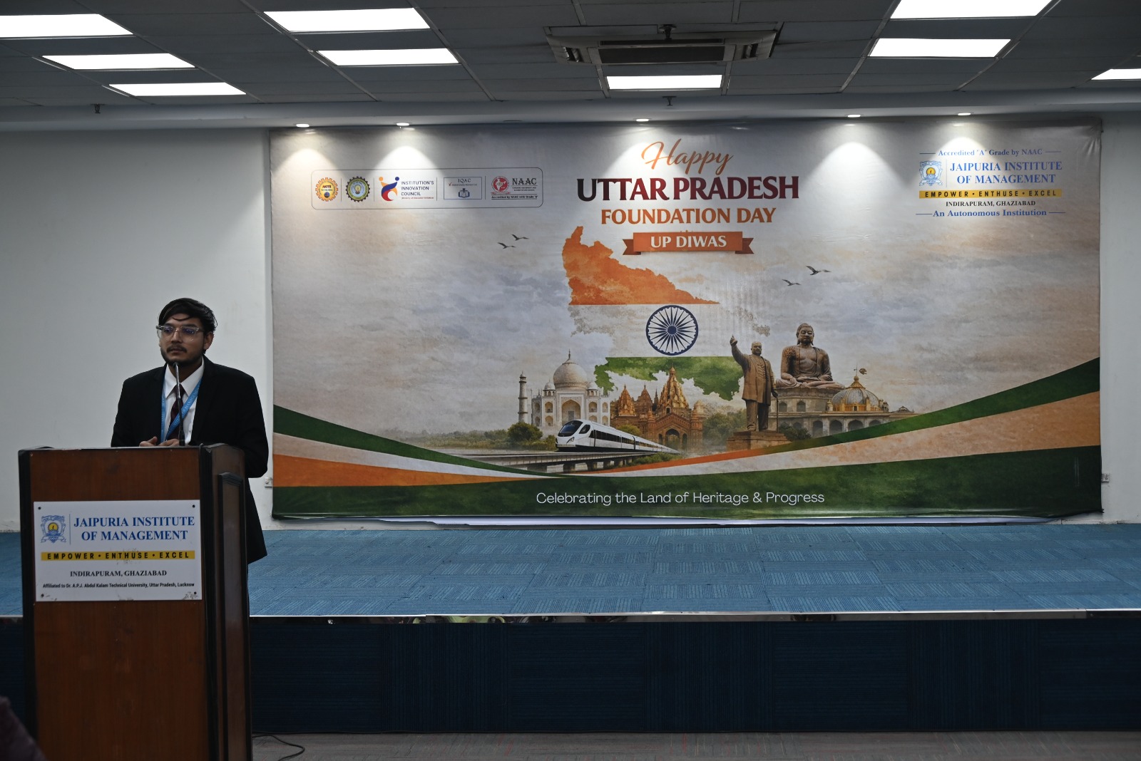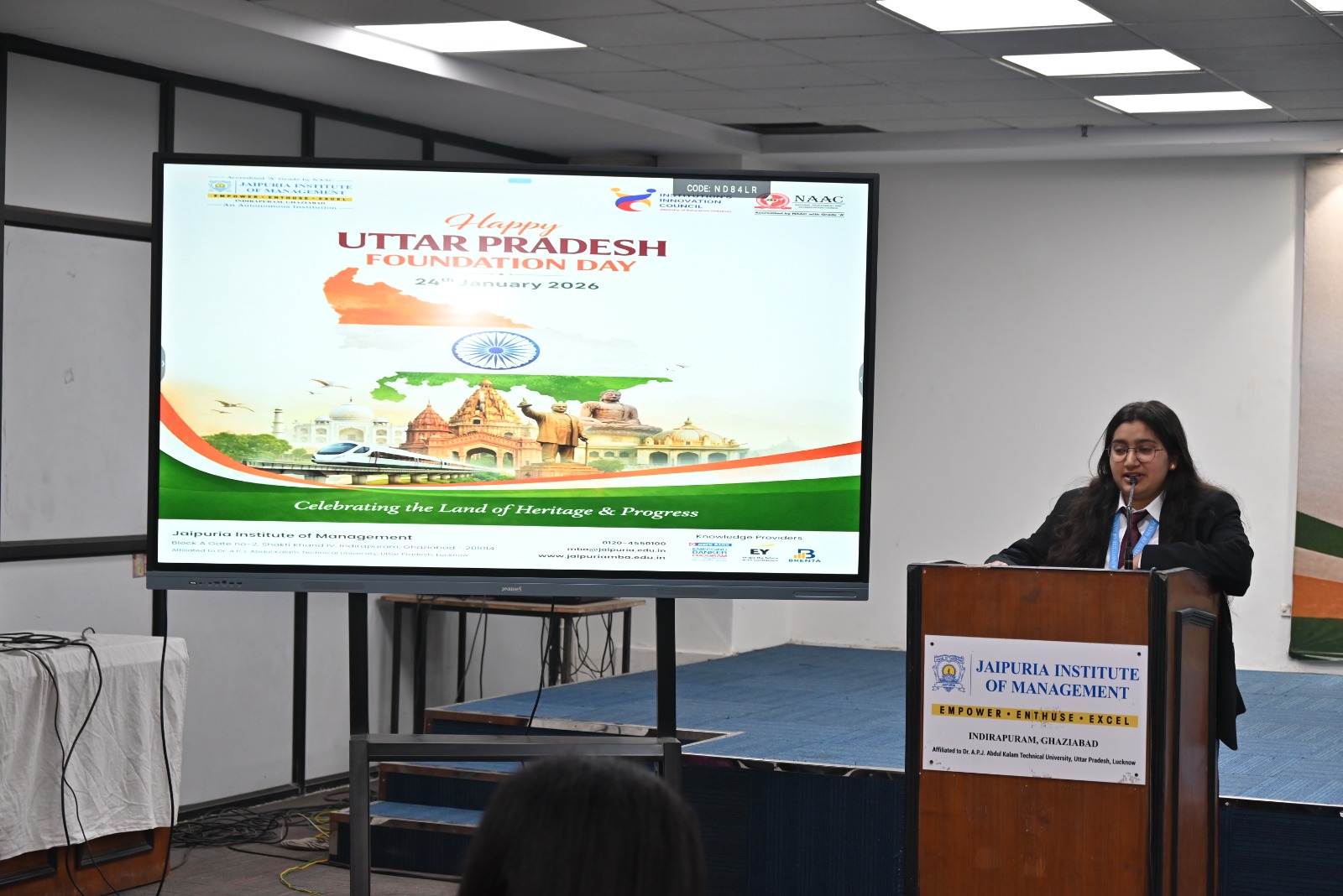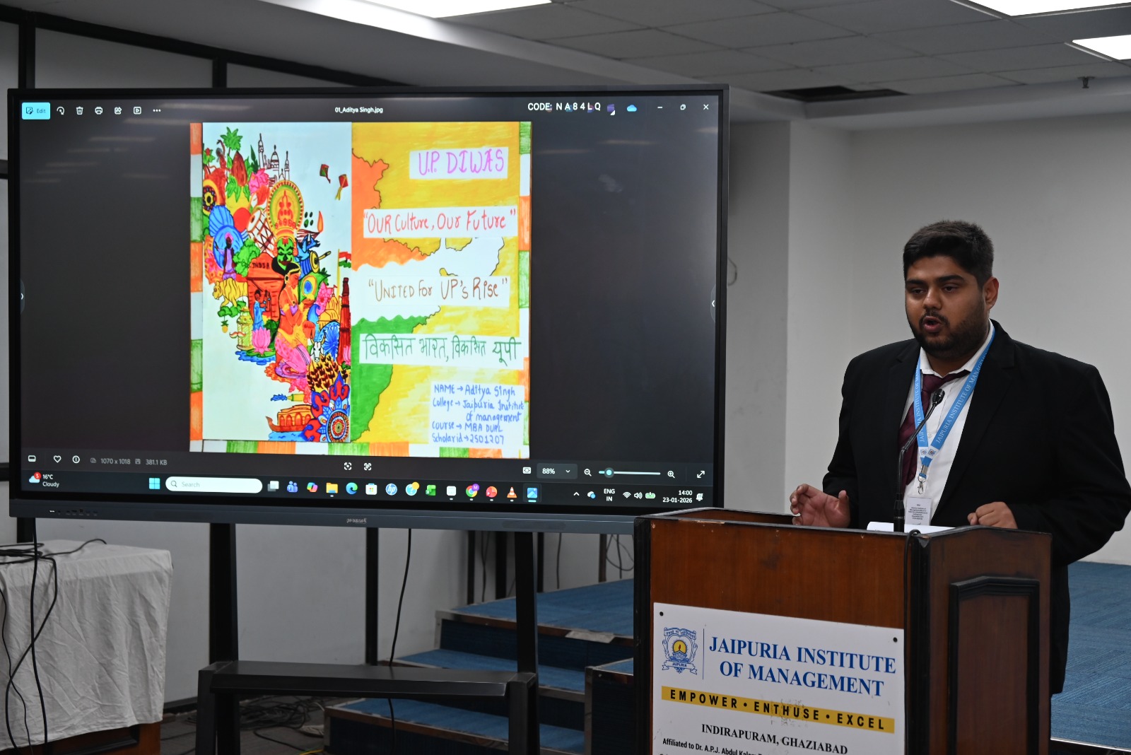 The Jaipuria Institute of Management, Ghaziabad, through its AICTE Committee, commemorated Uttar Pradesh Foundation Day (UP Diwas) on 24 January 2026 at the institute campus. The celebration was organised in accordance with the directions of the Hon’ble Governor and University guidelines, with the objective of fostering awareness, cultural pride, and responsible citizenship among students.