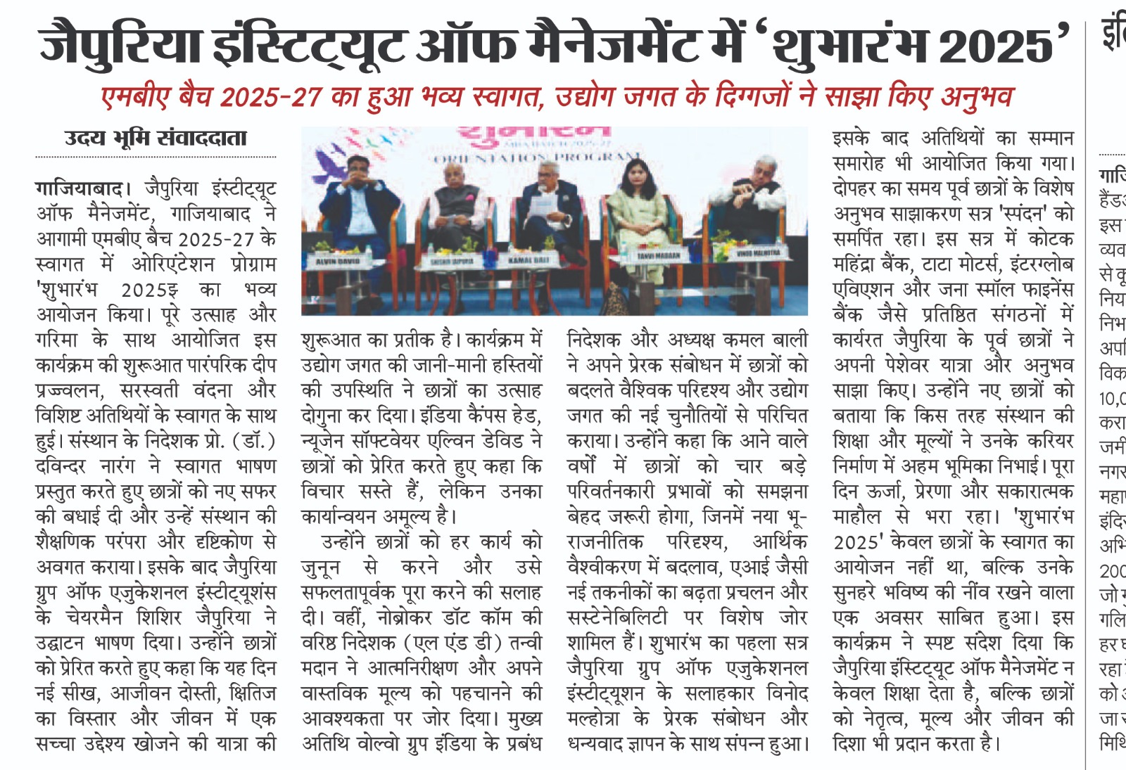 Post the inaugural session, the afternoon was dedicated to Spandan, an alumni experience-sharing session. Distinguished alumni from leading organizations such as Kotak Mahindra Bank, Tata Motors, Interglobe Aviation, and Jana Small Finance Bank engaged with the new batch, recounting their professional journeys and learnings from Jaipuria. Their stories offered inspiration and practical insights into the corporate world. The day-long program concluded on a note of enthusiasm and optimism, marking the beginning of an enriching academic and professional journey for the new batch of students.