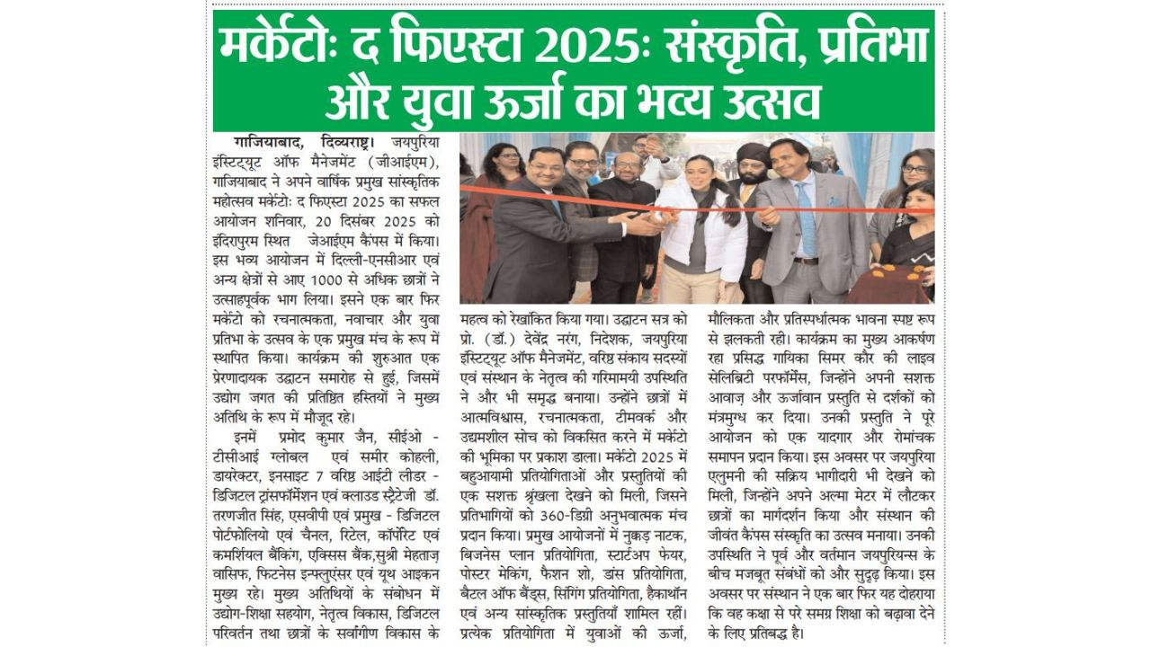 The Jaipuria Institute of Management, Ghaziabad successfully hosted its flagship annual cultural extravaganza, Mercato: The Fiesta 2025, on 20 December 2025 at the Indirapuram campus. The event witnessed the enthusiastic participation of over 1000 students from across Delhi NCR and beyond, reinforcing Mercato’s reputation as a vibrant platform for creativity, innovation, and youthful expression.