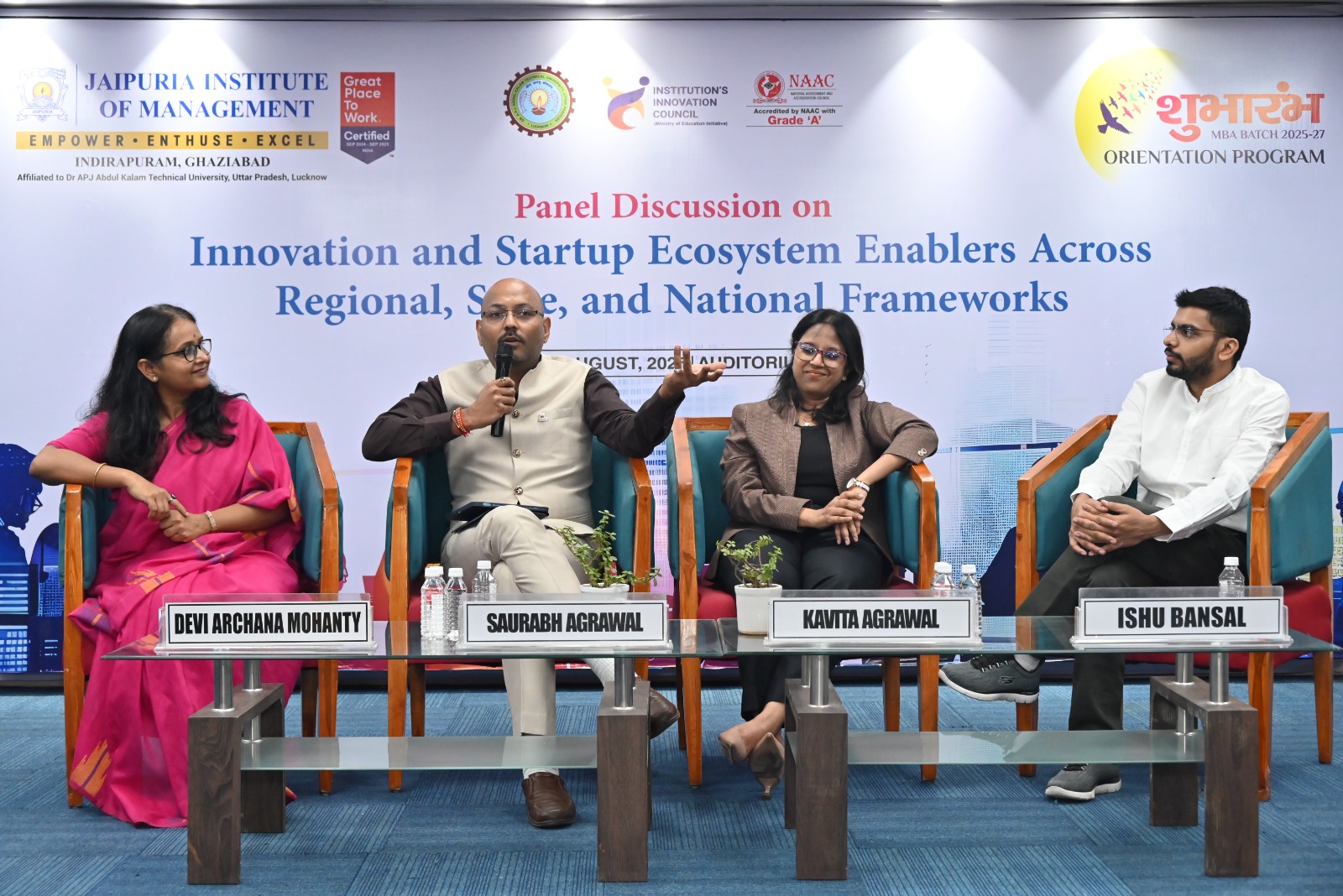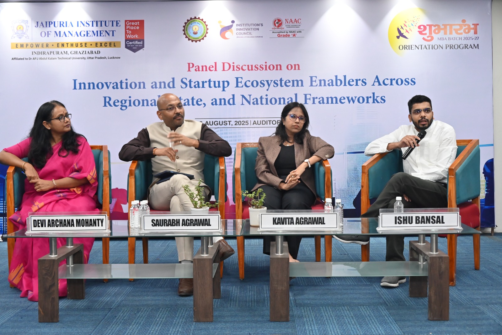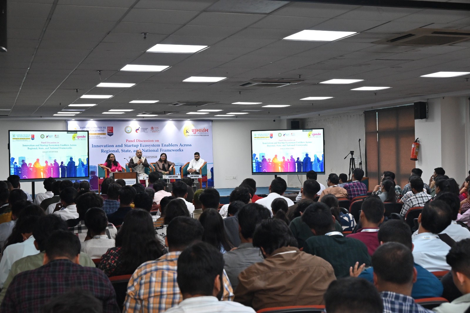 On August 28, 2025, Jaipuria Institute of Management, Ghaziabad hosted an engaging panel discussion on “Startup Ecosystem Enablers across Regional, State, and National Framework” at the JIM Auditorium. The session was designed to give students first-hand exposure to the entrepreneurial ecosystem, featuring real-world insights from successful startup founders.