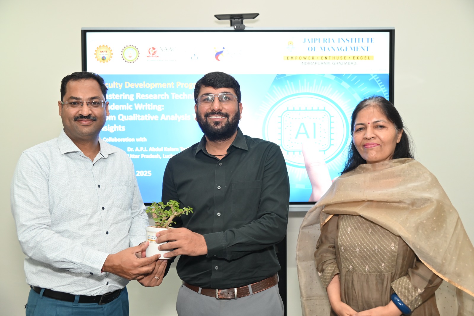 The third day of the 5-day Faculty Development Program (FDP), themed “Mastering Research Techniques & Academic Writing: From Qualitative Analysis to AI-Driven Insights,” was successfully held on June 22, 2025, at Jaipuria Institute of Management, Ghaziabad.